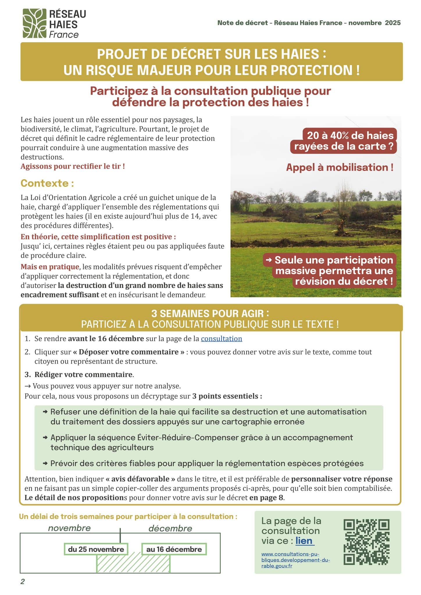 Cependant, dans sa version actuelle, le texte présente de nombreux points de vigilance et pourrait conduire à une augmentation significative des destructions de haies, pourtant indispensables à la biodiversité, au paysage et au bon fonctionnement des écosystèmes agricoles.
