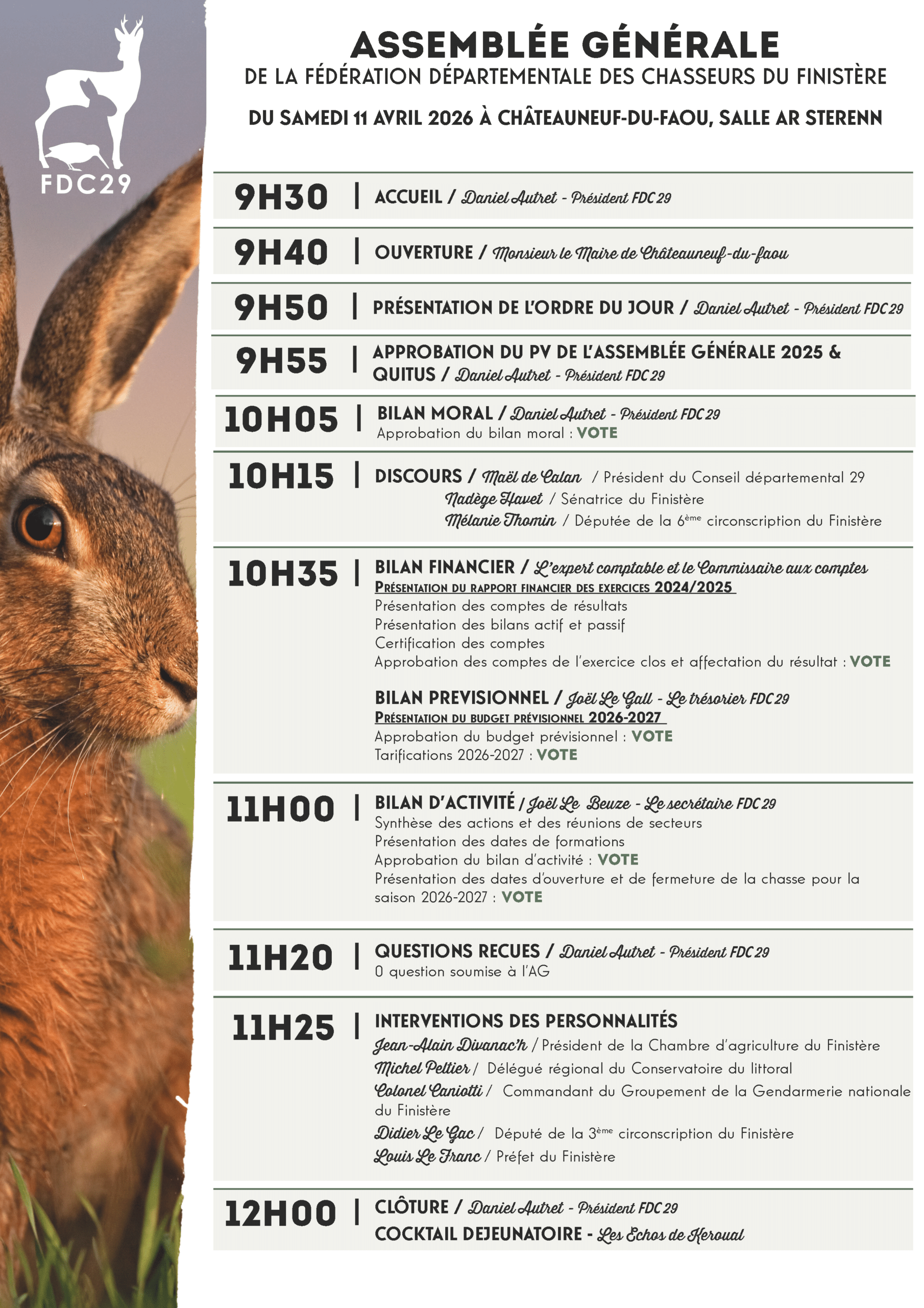 Ce samedi, à Châteauneuf-du-Faou, la Fédération Départementale des Chasseurs du Finistère a tenu son Assemblée Générale 2026.