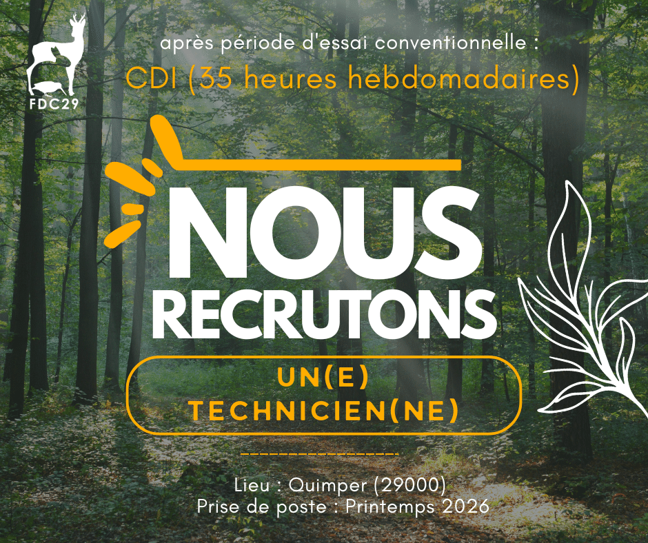 La Fédération Départementale des Chasseurs du Finistère (FDC 29) recrute un(e) technicien(ne) afin de renforcer son équipe technique et poursuivre ses actions en faveur d’une gestion durable de la faune sauvage et des habitats sur l’ensemble du département.