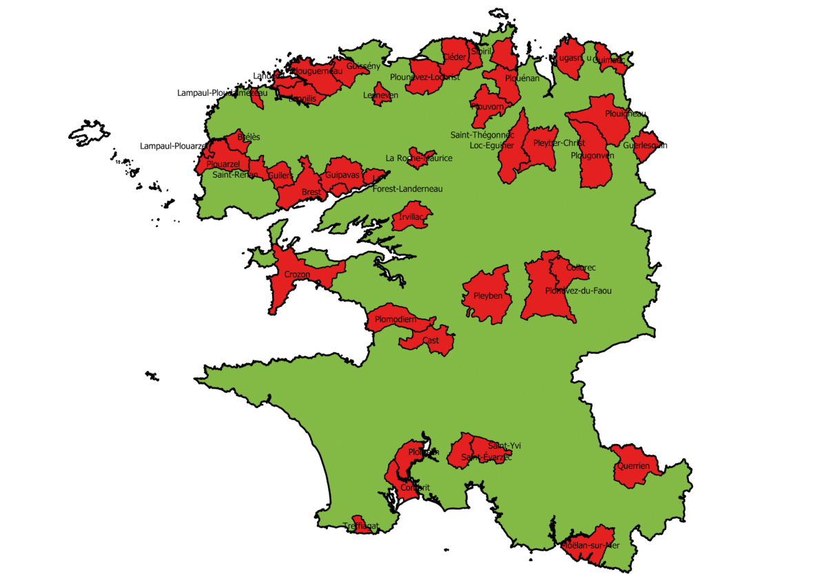 Brèles, Brest, Cast, Cléder, Collorec, Combrit, Crozon, la Forest-Landerneau, Guerlesquin, Guilers, Guimaëc, Guipavas, Guissény, Irvillac, Lampaul-Plouarzel, Lampaul-Ploudalmézeau, Landéda, Lannilis, Lesneven, Moëlan-sur-Mer, Pleyben, Pleyber-Christ, Plomelin, Plomodiern, Plonévez-du-Faou, Plouarzel, Plouénan, Plougasnou, Plougonven, Plouguerneau, Plouigneau, Plounévez-Lochrist, Plouvorn, Querrien, la Roche-Maurice, Saint-Évarzec, Saint-Pol-de-Léon, Saint-Renan, Saint-Thégonnec Loc-Eguiner, Saint-Yvi, Sibiril, Treffiagat.