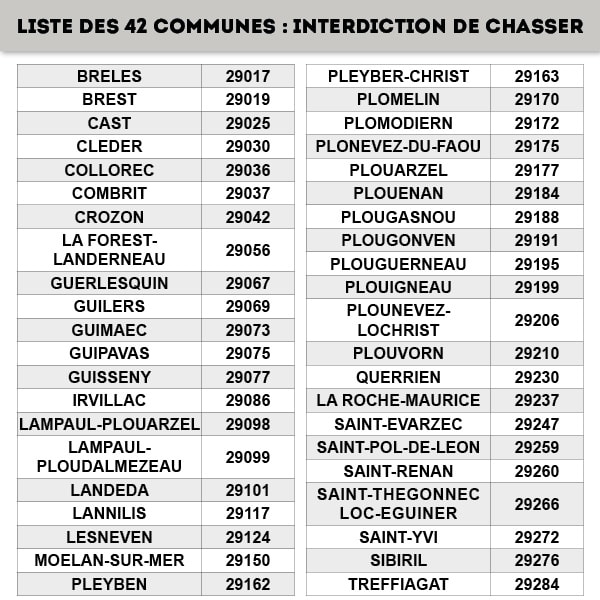 La suspension de la chasse samedi 10 janvier est désormais maintenue uniquement dans les 42 communes qui doivent bénéficier d’interventions des agents d’ENEDIS à savoir :