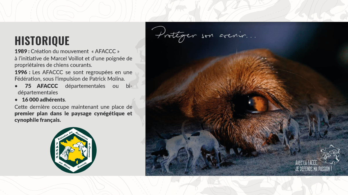 Le mouvement « AFACCC » fut lancé en 1989 à l’initiative de Marcel Voillot et d’une poignée de propriétaires de chiens courants, en réponse aux intolérances témoignées par d’autres chasseurs à l’égard de la chasse aux chiens courants et tout particulièrement dans le quart nord-est de notre pays. La première AFACCC fut créée en Haute-Marne puis le mouvement va se développer rapidement pour s’implanter dans de nombreux départements et se structurer.