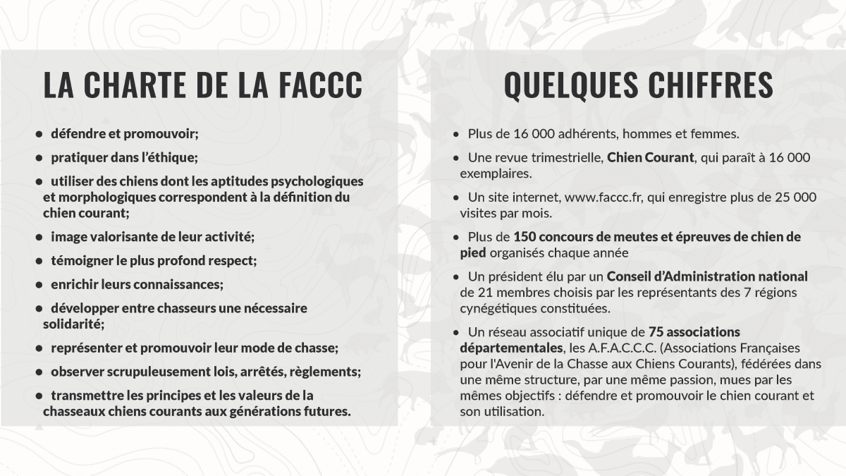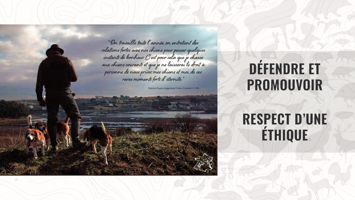 En outre, elles fédèrent leurs adhérents autour d’une éthique illustrée par la devise du mouvement « Aimer la chasse pour le chien » et en conformité avec la charte nationale. Elles permettent aussi une meilleure connaissance et une meilleure prise en compte de la réglementation cynégétique relative à l’utilisation des chiens courants, en diffusant à leurs membres des supports didactiques et pédagogiques.