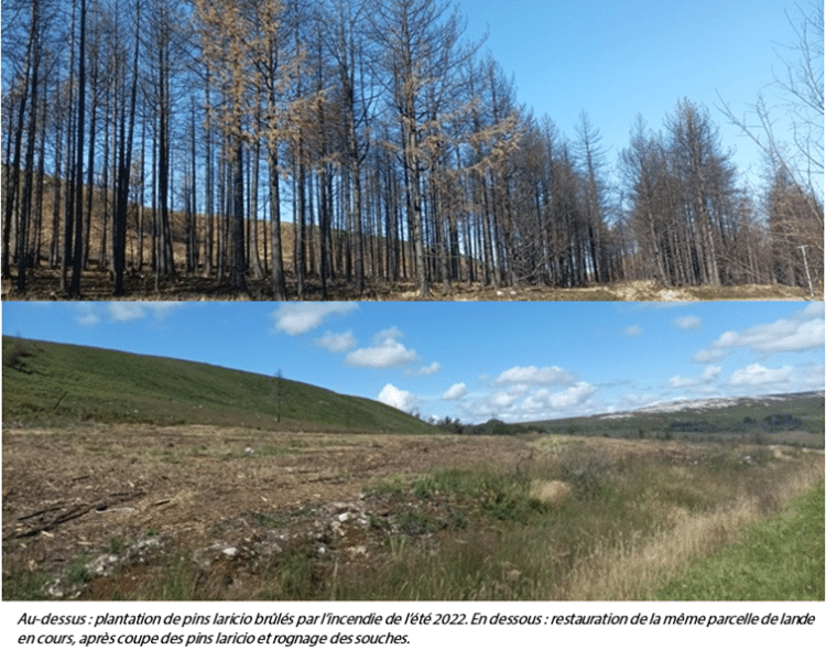 Certaines de ces actions ont été réalisées en priorité à la suite des incendies, survenus dans les Monts d’Arrée en 2022, et notamment la suppression de boisements de résineux partiellement brûlés. Ainsi, 8 hectares de plantations de pins laricio et de jeunes recrûes d’épicéas ont été défrichés, permettant à terme une revitalisation de la lande mésophile présente en sous-strate.