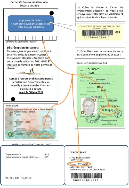 Dans un premier temps, avant utilisation, il vous faut préparer votre carnet en y apposant le timbre CPB sur prévu à cet effet sur votre courrier de validation annuelle, comme décrit dans l’image ci-dessous et reporter le numéro de votre permis de chasser.