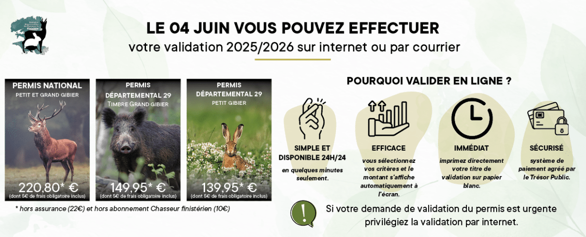 La fédération des chasseurs du Finistère n’expédie pas les validations du permis de chasser. Ne cochez pas l’option proposée par le site pour l’expédition de la validation.