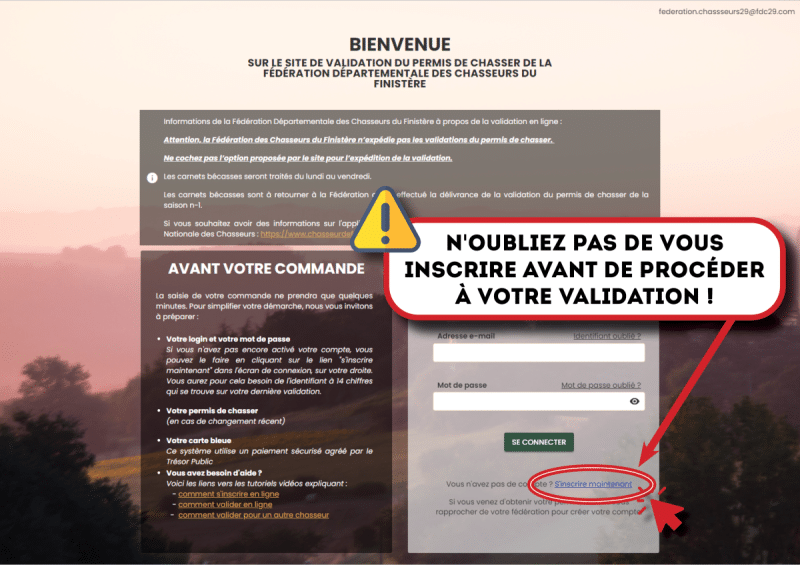 La fédération des chasseurs du Finistère n’expédie pas les validations du permis de chasser. Ne cochez pas l’option proposée par le site pour l’expédition de la validation.